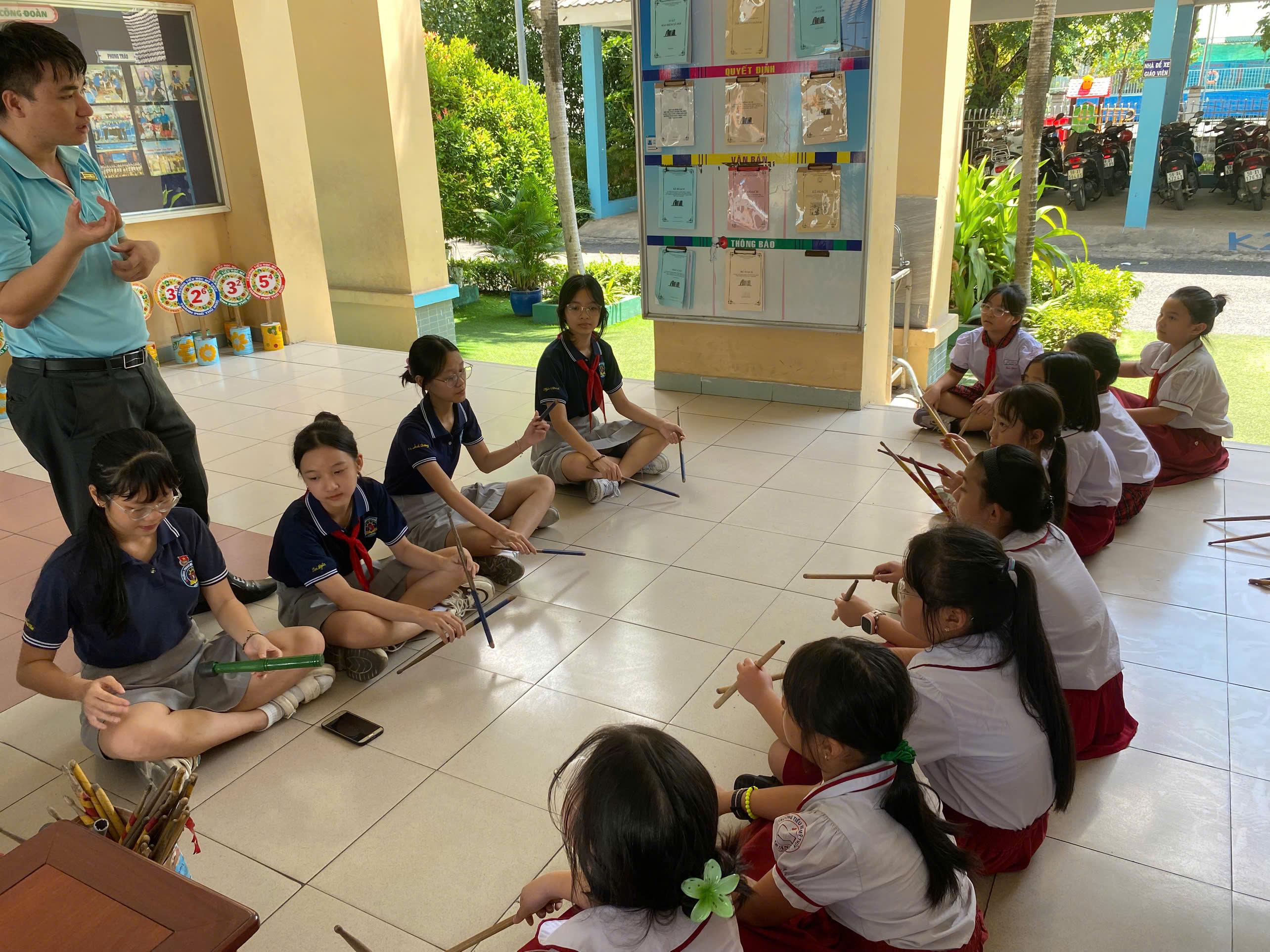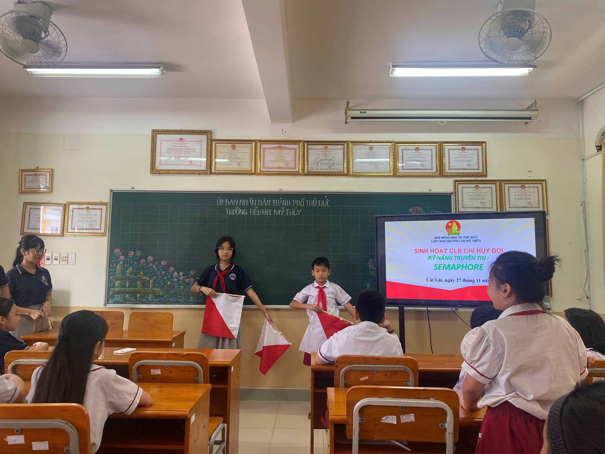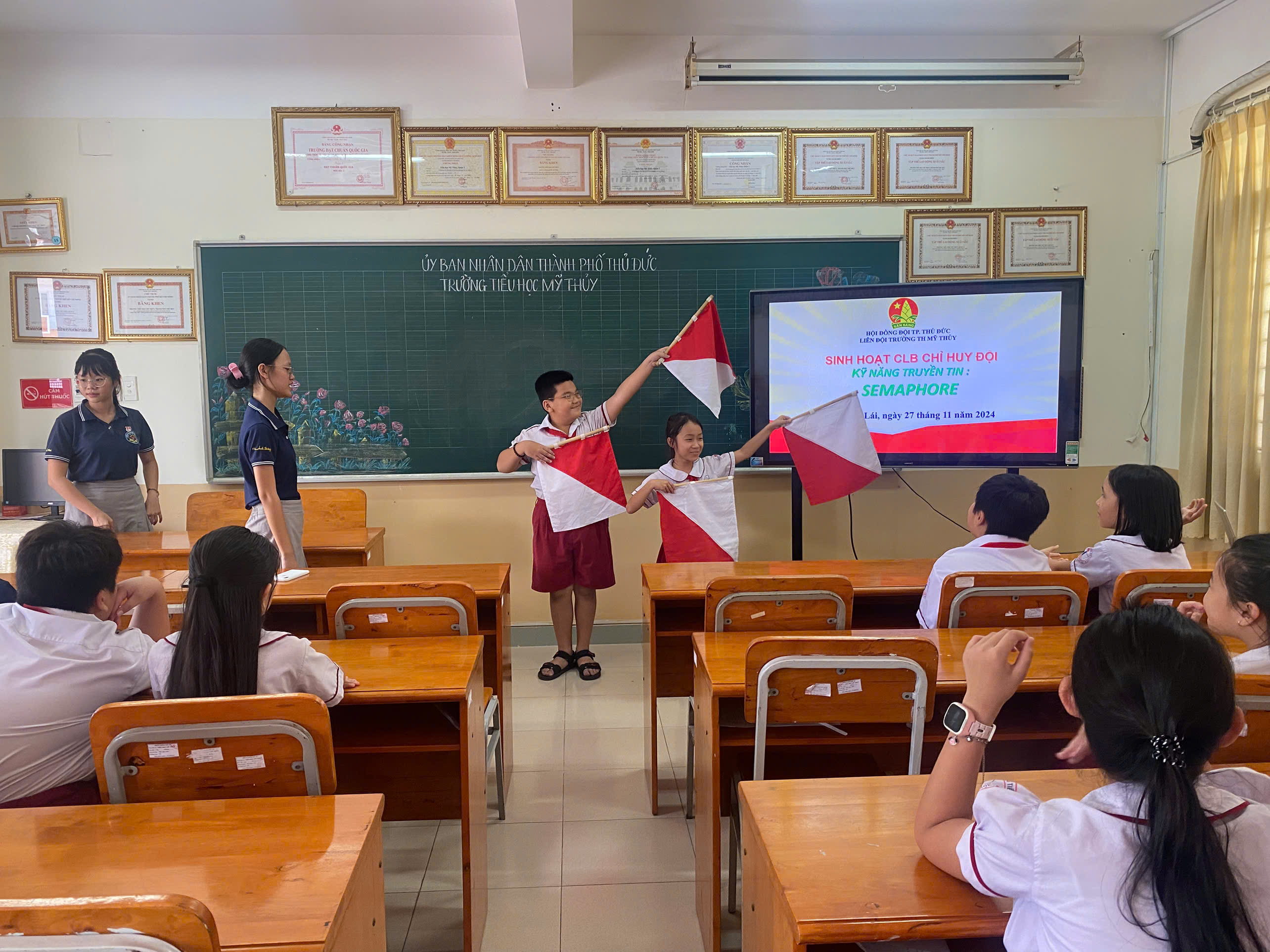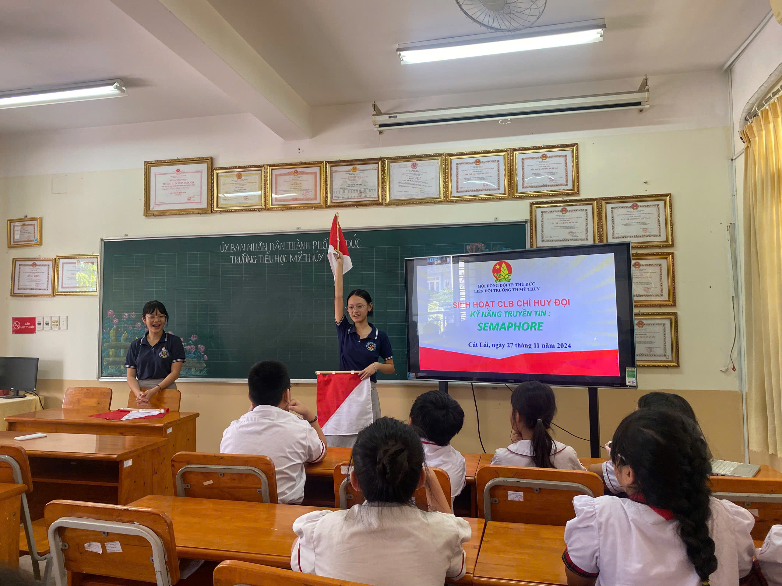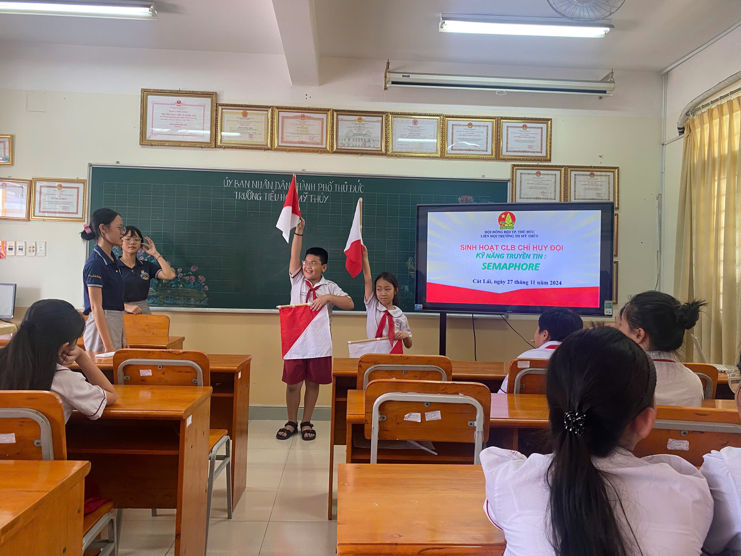 🍀Tại chương trình các bạn học sinh trường Tiểu học Mỹ Thủy đã được gặp gỡ và giao lưu với các anh chị trong BCH Liên đội Cát Lái, bên cạnh đó các bạn còn được các anh chị và giáo viên TPT Đội hướng dẫn và cùng luyện tập một số kĩ năng như: semaphore, morse, trống Đội,........